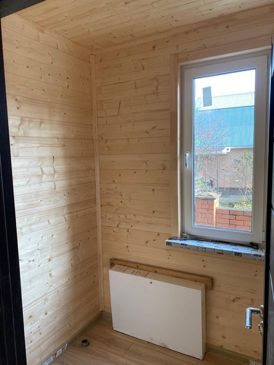 - для отделки внутренних стен использовалась имитация бруса камерной сушки 140 мм (сорт АБ) и гипсокартон, устойчивый к влаге.